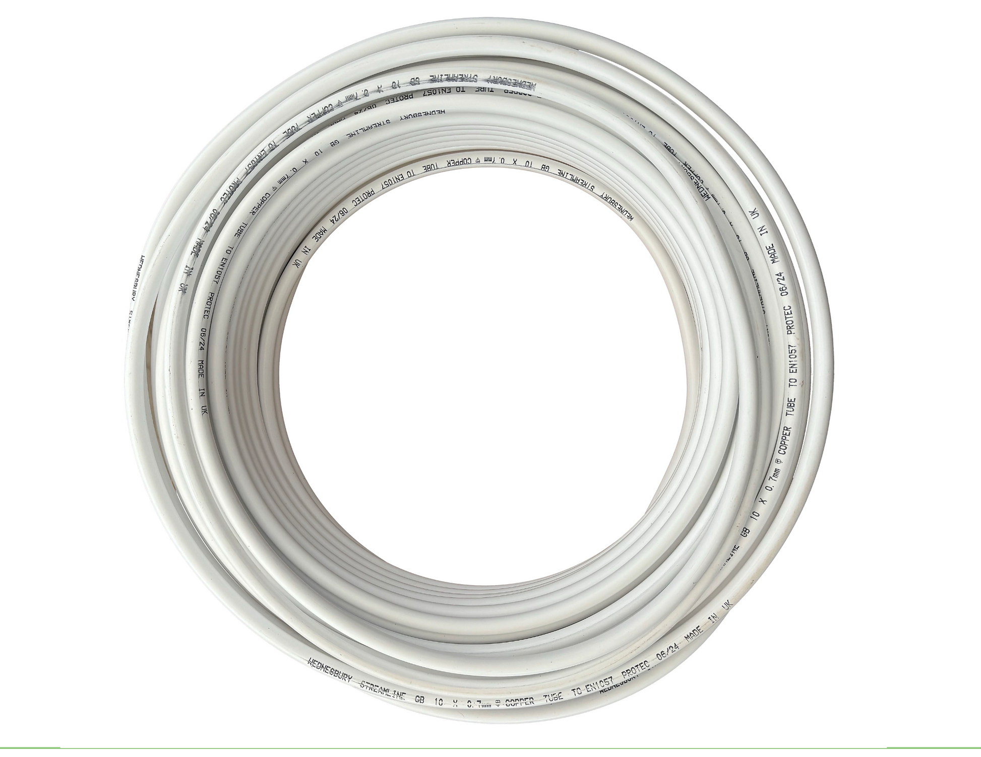 This white plastic coated 8mm/10mm copper pipe / tube is very popular as an oil supply pipe, used between the oil tank and central heating boiler.